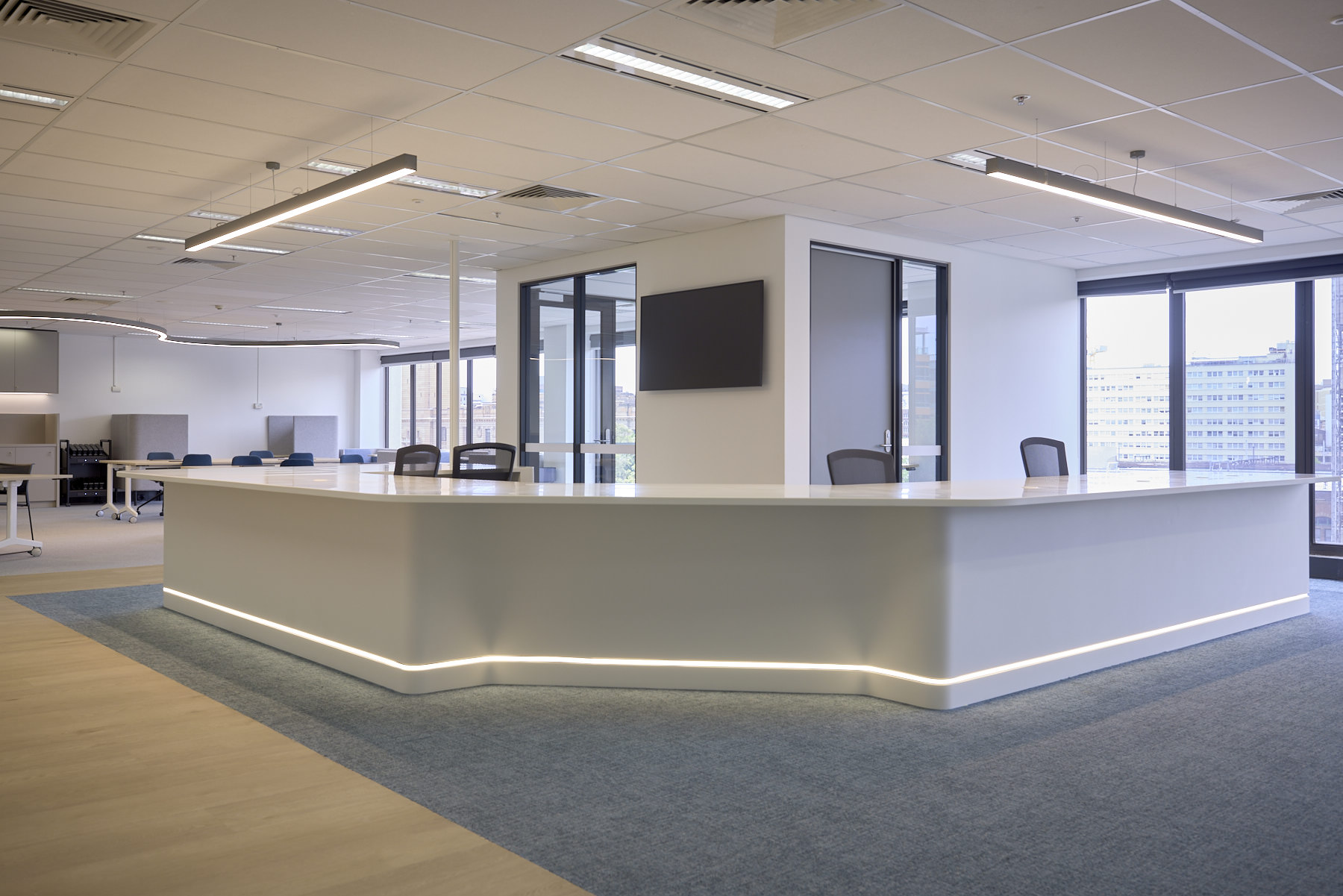 Our team handled the full strip-out that completely transformed an existing floor, navigated some lift sizing challenges (carried things upstairs like it's the 1800s 💪), and delivered a large Corian reception desk that's basically one continuous piece - just this smooth flowing surface that wraps the entire reception area.